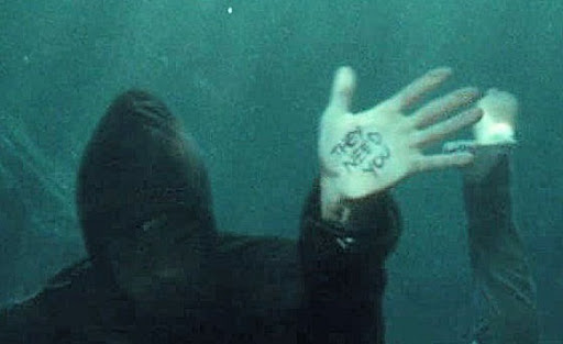-Charlie en el acuario-interrogatorio de policia con un mensaje en su mano que decía “They Need You” (“Te Necesitan”).